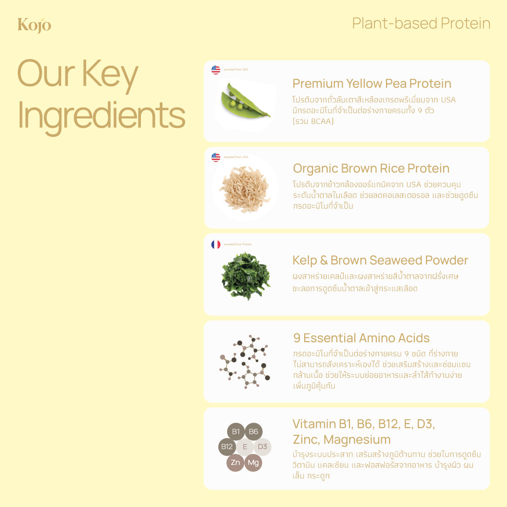Kojo Plant-Based Protein Made from 100% pea and brown rice protein, this is a new choice for health enthusiasts. It's easy to consume, keeps you full for longer, and is rich in vitamins and nutritional value. It helps support the body’s repair and rebuilding processes.