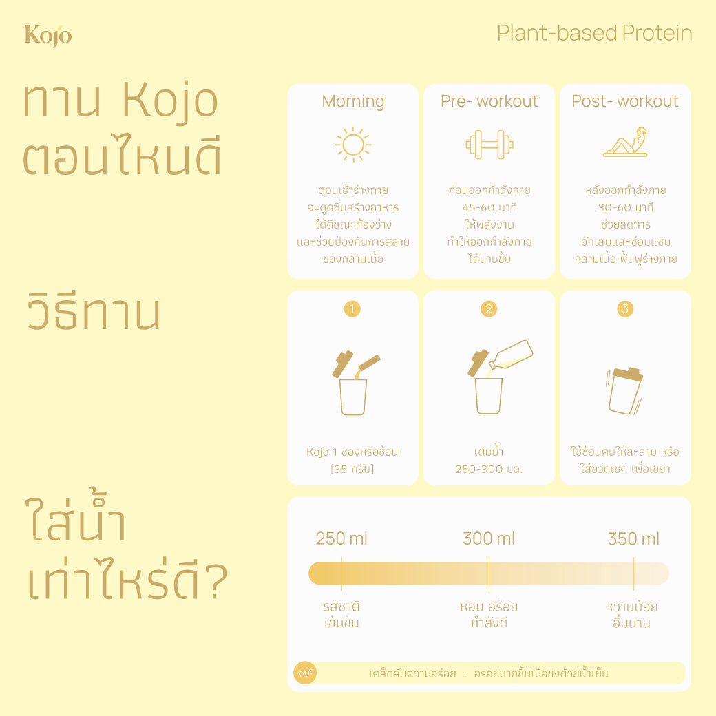 : Mix 1 sachets/scoop (35g) with 250-300 ml of water. Stir with a spoon to dissolve, or put in a shaker bottle and shake. It tastes even better when mixed with cold water.